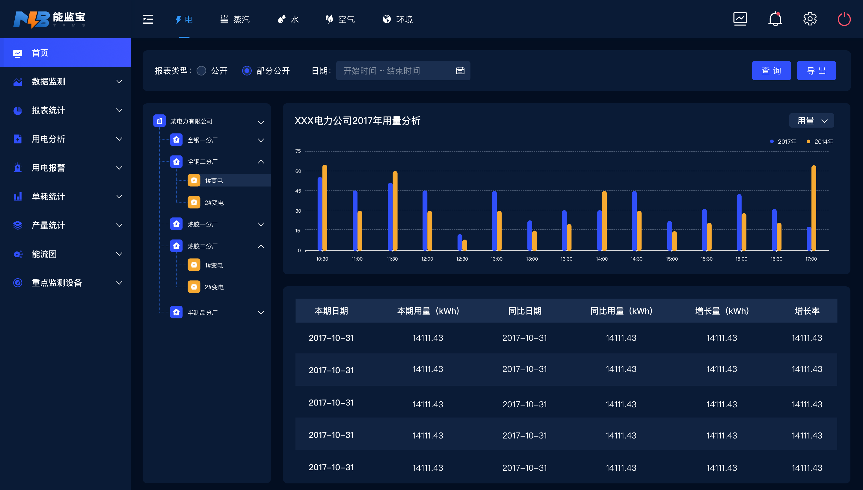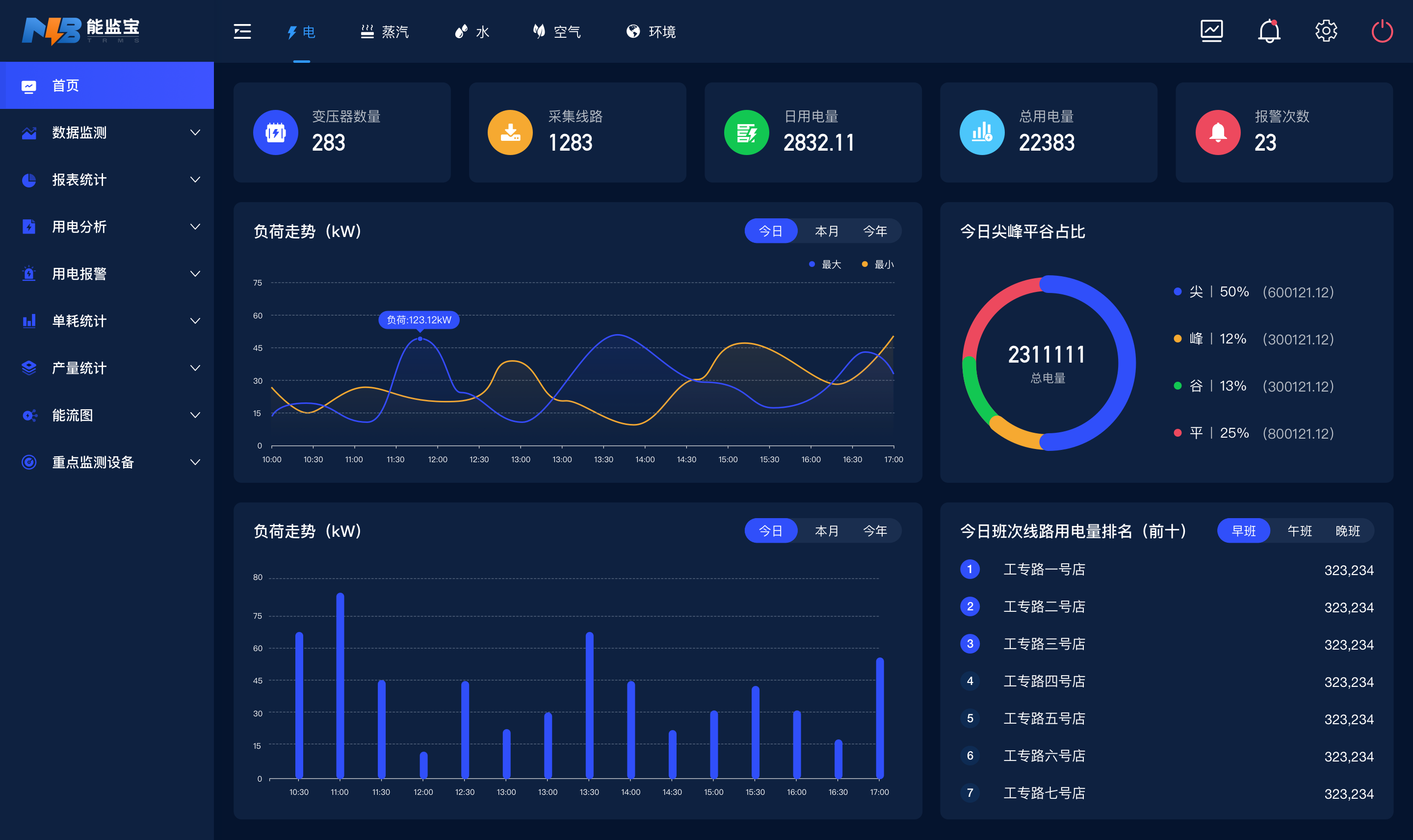 系統通過(guò)AI人工智能算法,以圖標透視等方式展現,支持圖表導出,為決策者和管理者提供精準施策的能源管理依據。